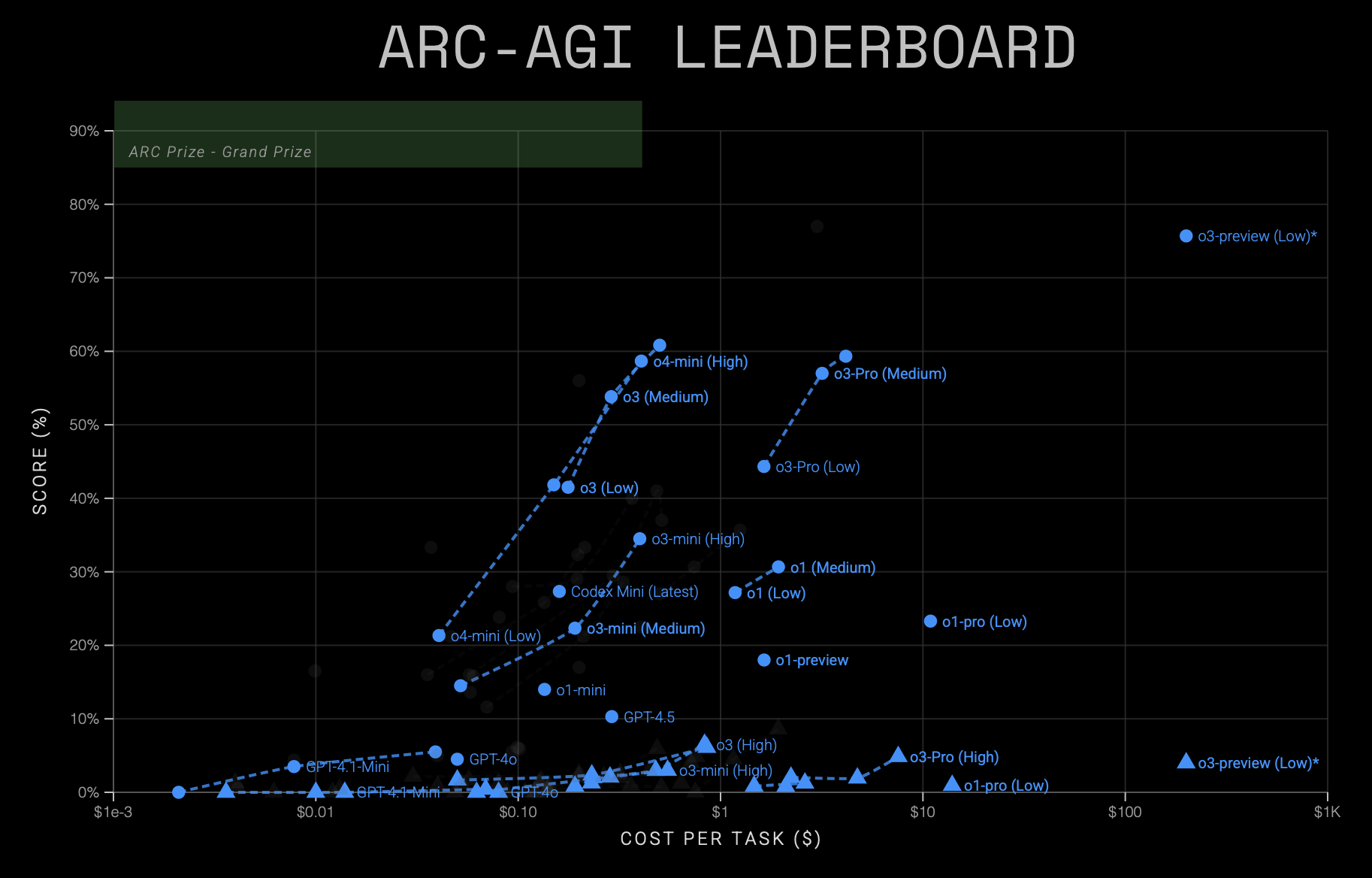 The ARC-AGI leaderboard now provides exactly the kind of graphs I was seeking, allowing comparisons between different model classes from the same company — or even from different companies. For example, here are all of OpenAI’s models (as of June 2025):